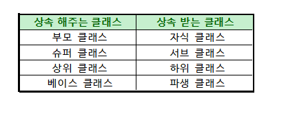 이미 만들어져 있는 클래스로 상속해주는 클래스를 부모클래스, 또는 상위클래스 라고 부른다.