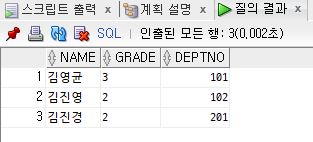 3번째줄 '김%'에서 김__ 언더바를 2개 붙이면 김XX 3글자인 학생 검색 만약 김_ 언더바 하나면 김X 2글자인 학생 검색