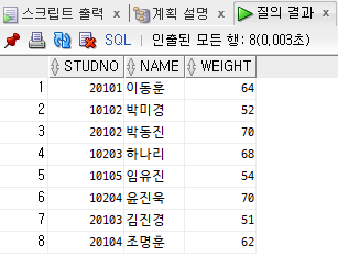 SELECT STUDNO, NAME, GRADE, DEPTNO, WEIGHT