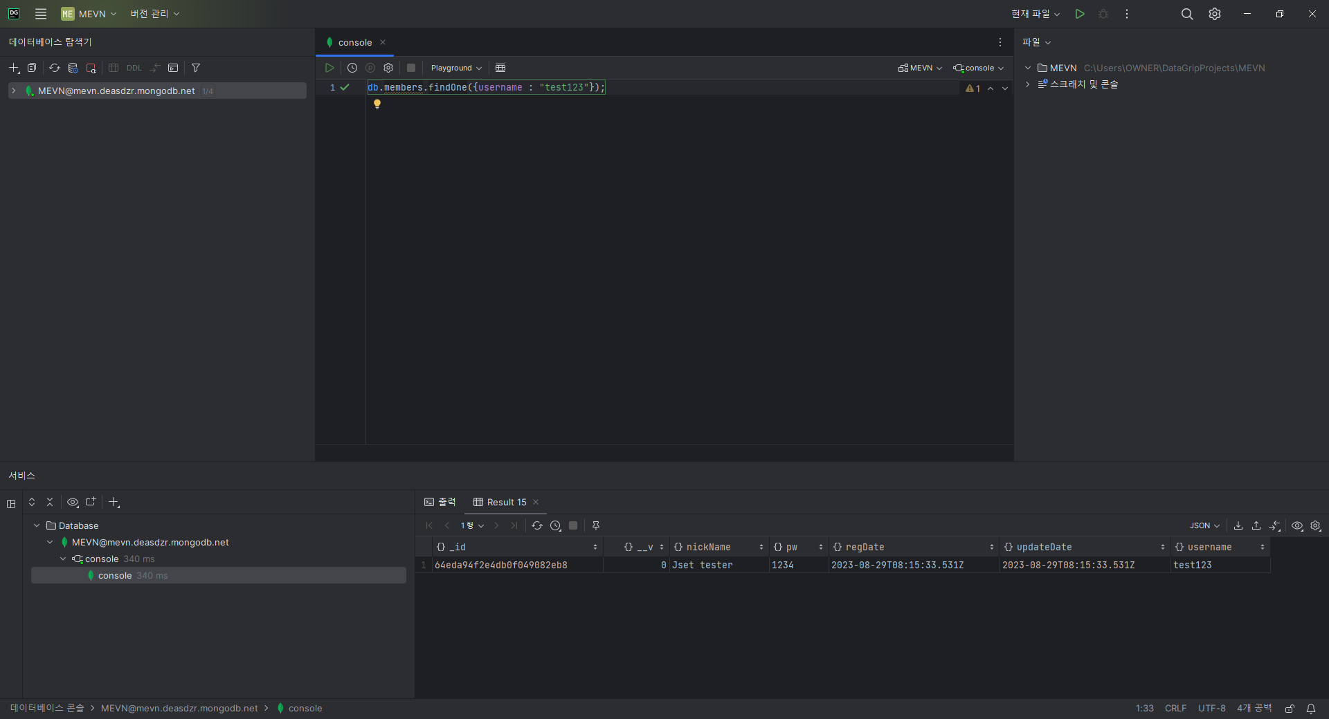 * 아래 방법은 mongodb 클러스터 생성, datagrip설치를 생략하고 진행