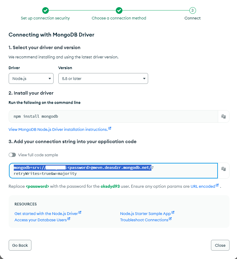 - ex)mongodb+srv://사용자명:비밀번호@mevn.deasdzr.mongodb.net/document명