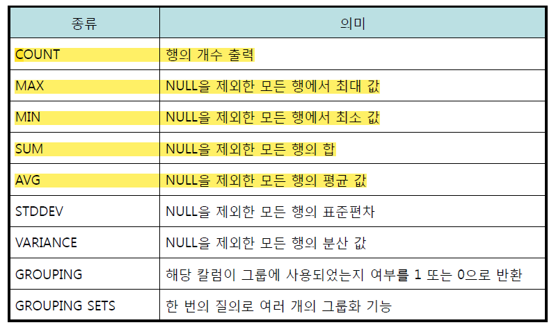 - 테이블의 전체 행을 하나 이상의 컬럼을 기준으로 그룹화 하여 그룹별로 결과를 출력하는 함수