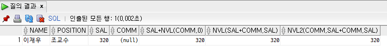 SELECT NAME, POSITION, SAL, COMM, SAL+COMM, SAL+NVL(COMM, 0), NVL(SAL+COMM, SAL)