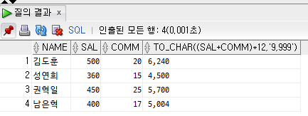 SELECT NAME, SAL, COMM, TO_CHAR((SAL+COMM)*12, '9,999')