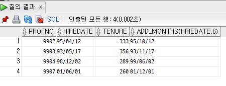 | MONTHS_BETWEEN | 날짜와 날짜 사이의 개월을 계산 | 숫자 |