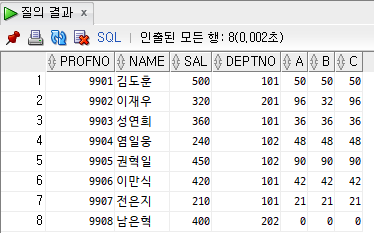 예제)교수테이블에서 소속 학과에 따라 보너스를 다르게 계산하여 출력