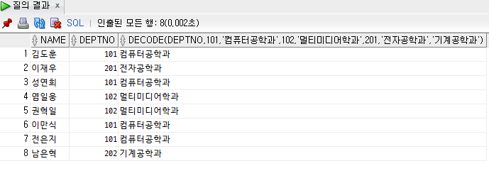 ,DECODE(DEPTNO, 101, '컴퓨터공학과', 102, '멀티미디어학과', 201, '전자공학과', '기계공학과')