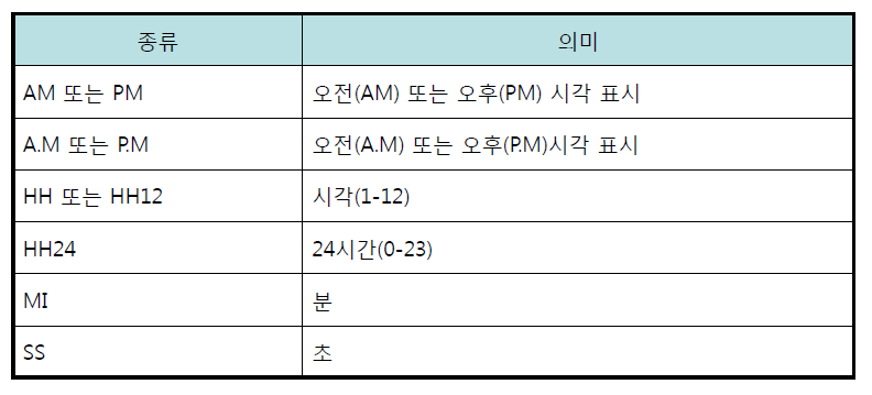 주로 사용되는 형식은 'HH24:MI:SS' 이다.