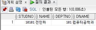 예제1) 전인하 학생의 학번, 학과번호, 학과 이름을 조회