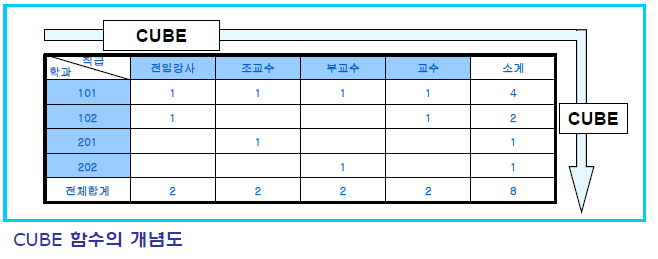 - GROUP BY절에 칼럼의 수가 n개이면 CUBE 그룹핑 조합은 2n개
