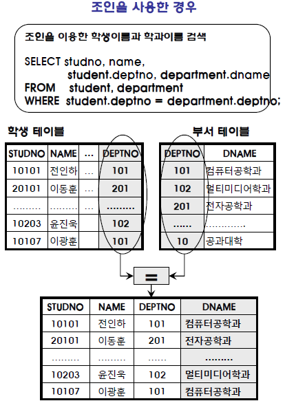 - 하나의 SQL 명령문에 의해 여러 테이블에 저장된 데이터를 한번에 조회할수 있는 기능