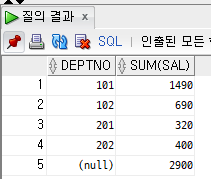 - GROUP BY 절에 칼럼의 수가 n개이면 ROLLUP 그룹핑 조합은 n+1개