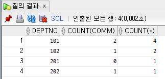 SELECT DEPTNO, COUNT(COMM), COUNT(*)