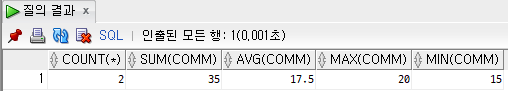 SELECT COUNT(*), SUM(COMM), AVG(COMM), MAX(COMM), MIN(COMM)