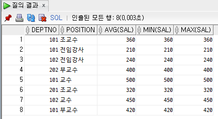SELECT DEPTNO, POSITION, AVG(SAL), MIN(SAL), MAX(SAL)