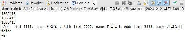 System.out.println(new Addr("1111", "홍길동").hashCode());