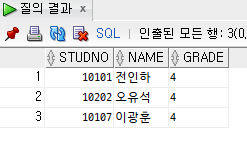 예제) 사용자 아이디가 'jun123'인 학생과 같은 학년인 학생의 학번, 이름, 학년을 출력