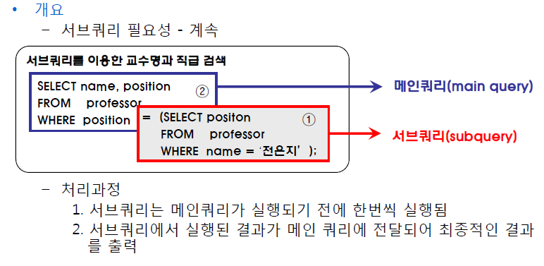 하나의 SQL명령문의 결과를 다른 SQL명령문에 전달하기 위해 두개이상의 SQL.명령문을 하나의 SQL명령문으로 연결하여 처리하는 방법