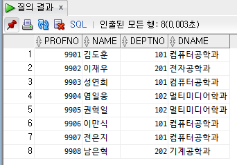 SELECT PROFNO, NAME, DEPTNO, DNAME