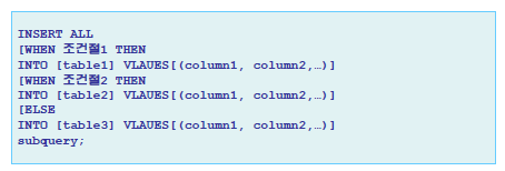 - ALL : 서브쿼리의 결과 집합을 해당하는 INSERT절에 모두 입력