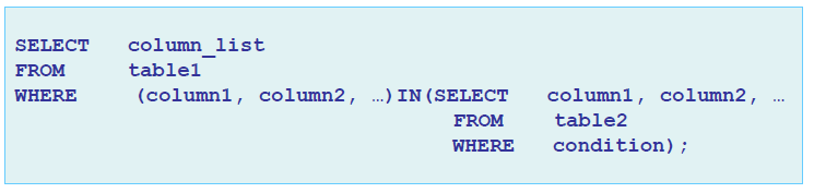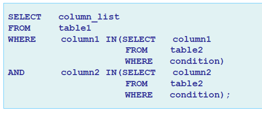 - 메인쿼리의 조건절에서도 서브쿼리의 컬럼 수만큼 지정해야 함
