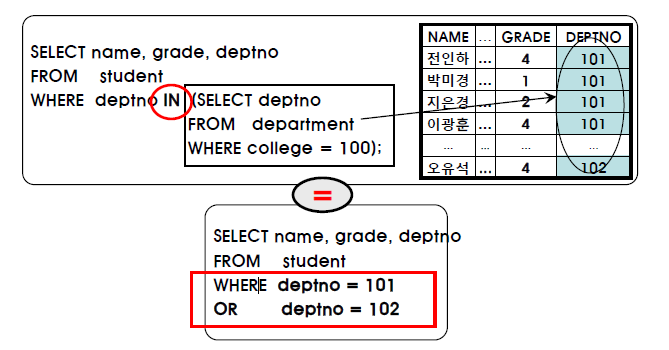 - 메인쿼리의 where절에서 서브쿼리의 결과와 비교할 경우에는 다중행 비교 연산자를 사용하여 비교
