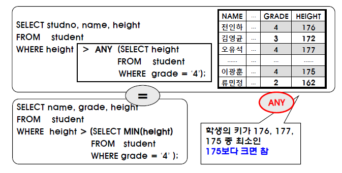 - 메인쿼리의 비교조건에서 서브쿼리의 출력 결과와 하나라도 일치하면 메인쿼리 조건절이 참이 되는 연산자