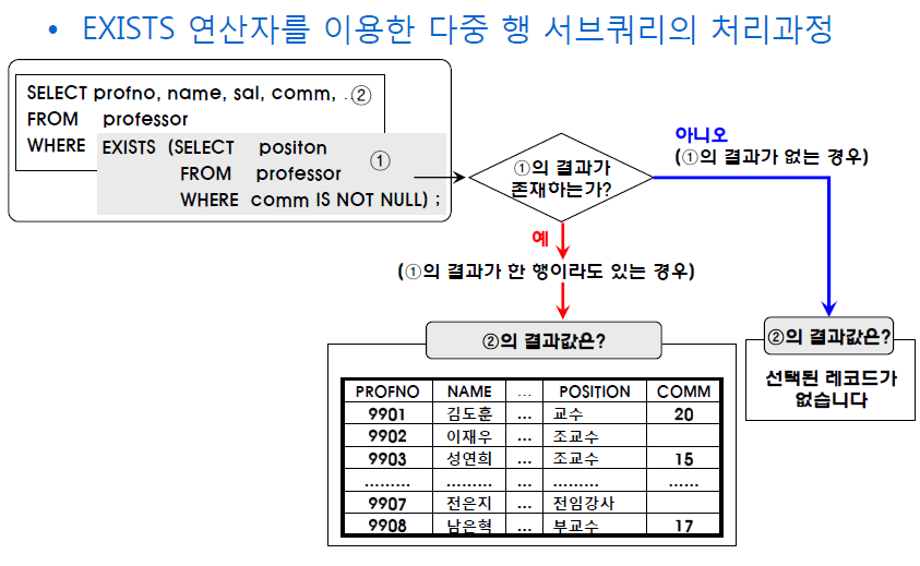 - 다중행 비교연산자 : IN, ANY, SOME, ALL, EXISTS