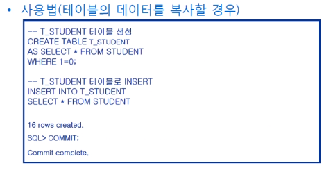 - 서브쿼리의 결과 집합은 INSERT 명령문에 지정된 칼럼 개수와 데이터 타입이 일치해야함