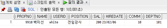 VALUES (9910, '백미선', 'white', '전임강사', 200, SYSDATE, 10, 101);
