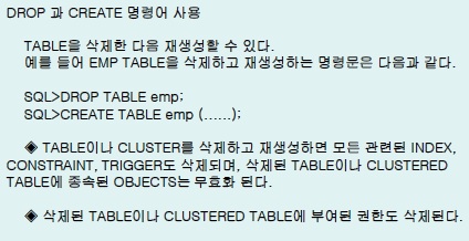- drop table 명령문 마지막에 cascade constraints옵션을 사용하여 무결성 제약조건을 동시에 삭제