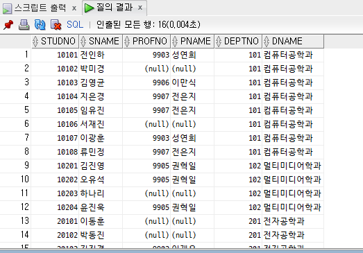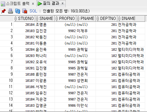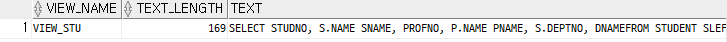 (SELECT STUDNO, S.NAME SNAME, PROFNO, P.NAME PNAME, S.DEPTNO, DNAME