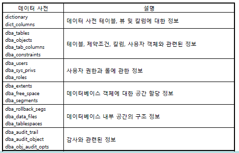 - 데이터베이스 관리자나 사용자에게 데이터 사전에 저장된 정보 조회 허용
