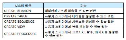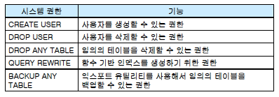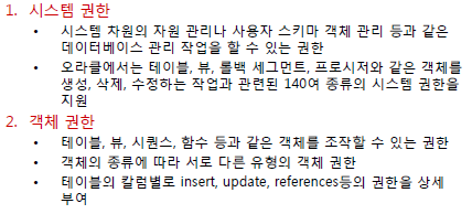 - 권한은 사용자가 데이터베이스 시스템을 관리하거나 객체를 이용할 수 있는 권리