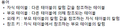 참조키 (외래키/ FK) 한 열과 참조된 테이블의 열간에 외래 키 관계를 설정하고 시행