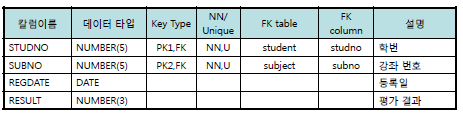 CONSTRAINT PK_SUGANG PRIMARY KEY(STUDNO, SUBNO), -- 테이블레벨