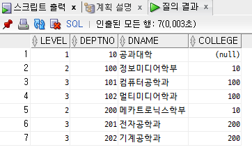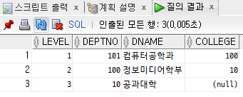SELECT LEVEL, DEPTNO, DNAME, COLLEGE