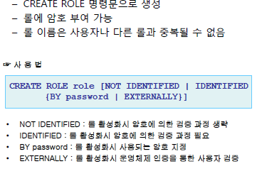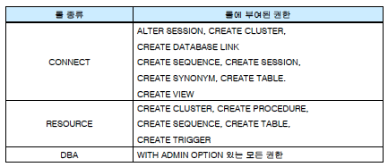 - 사용자 생성, 삭제, 사용자계정에서 객체의 생성 또는 수정, 데이터베이스 백업 관리