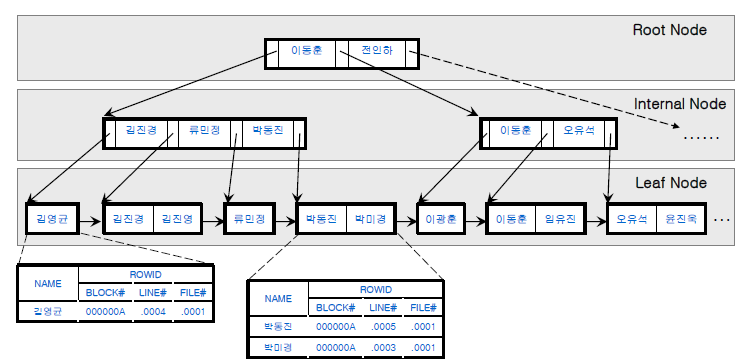 - 인덱스의 내부 구조는 B*-트리 형식으로 구성