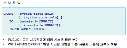 - 시스템 권한은 특정 사용자나 모든 사용자에게 부여 가능