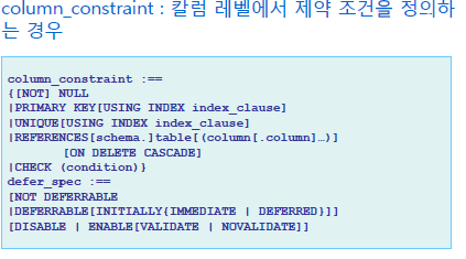 - 테이블 생성시 무결성 제약조건을 정의 가능